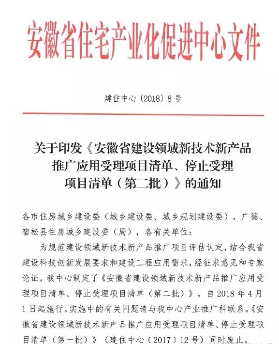 記得去年的時候安徽省住宅產業化促進中心發布了文件《安徽省建設領域新技術新產品推廣應用受理項目清單、停止受理項目清單(第一批)》,其中,一大波近幾年比較熱門的外保溫系統和材料被停止受理推廣,你還能通過微信發文了解《安徽省已經全面停止發泡水泥板、漿料類等保溫材料的推廣應用》,點擊即可進入。如今,第二批也正式出臺了,那么相對于去年發布的第一批清單目錄,第二批又有哪些新的變動呢?咱們仔細研究一下,以下是發文正文。